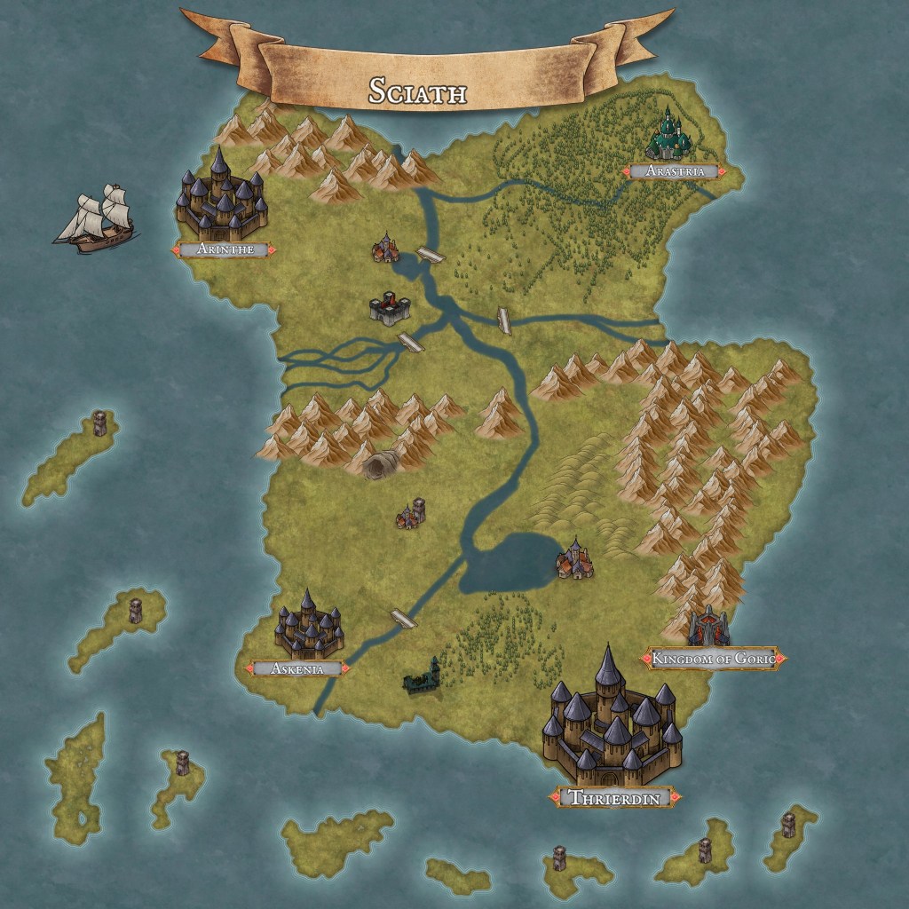 So, this map is the continent of Sciath, and some of the surrounding islands. Sciath is made up of at least four major realms (maybe more, you’ll have to wait and see).